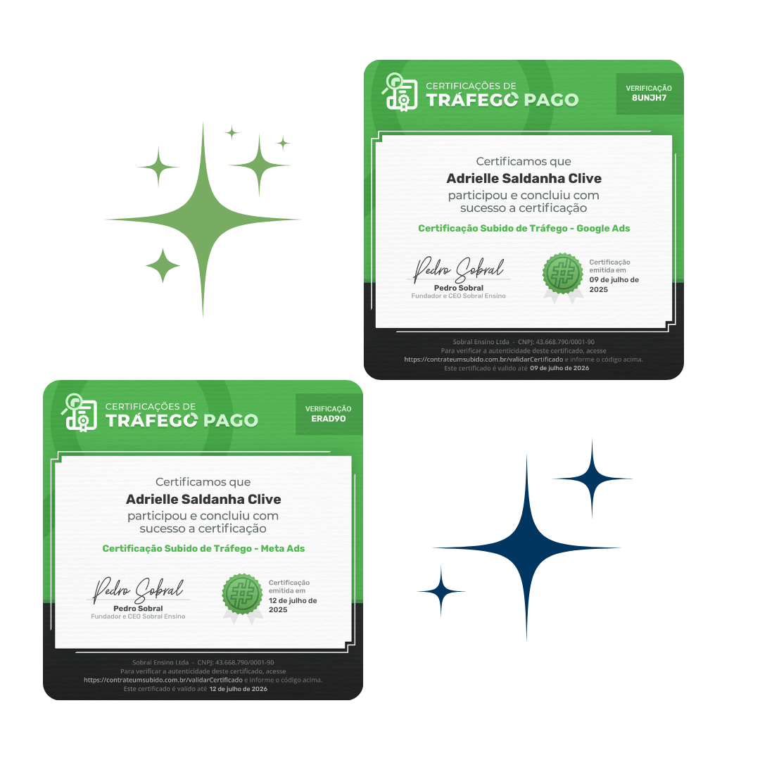 Já gerenciei mais de 6 dígitos em mídia paga, atendendo desde infoprodutores até negócios físicos. Certificada em Meta Ads e Google Ads pela Comunidade, minha missão vai além de rodar campanhas. Eu entro no campo com você, olho para o seu funil, para a sua oferta, para sua persona… e ajusto cada engrenagem para que o ROI não seja apenas uma sigla, mas uma realidade.